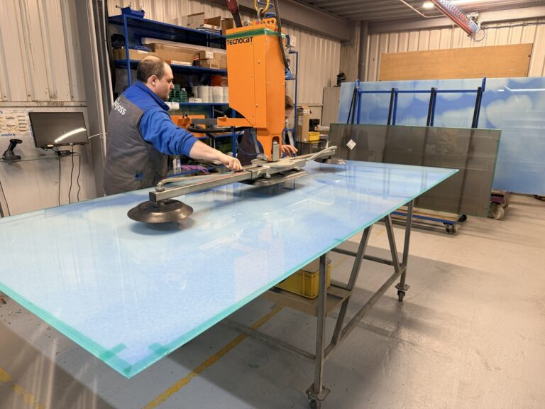 Trabajamos a medida Canteados, Biselados, Ingletes, Esrtías, Arenados, Pegados, Taladros, Cajeados, Serigrafías, Resinas, Fusing y Pintados.